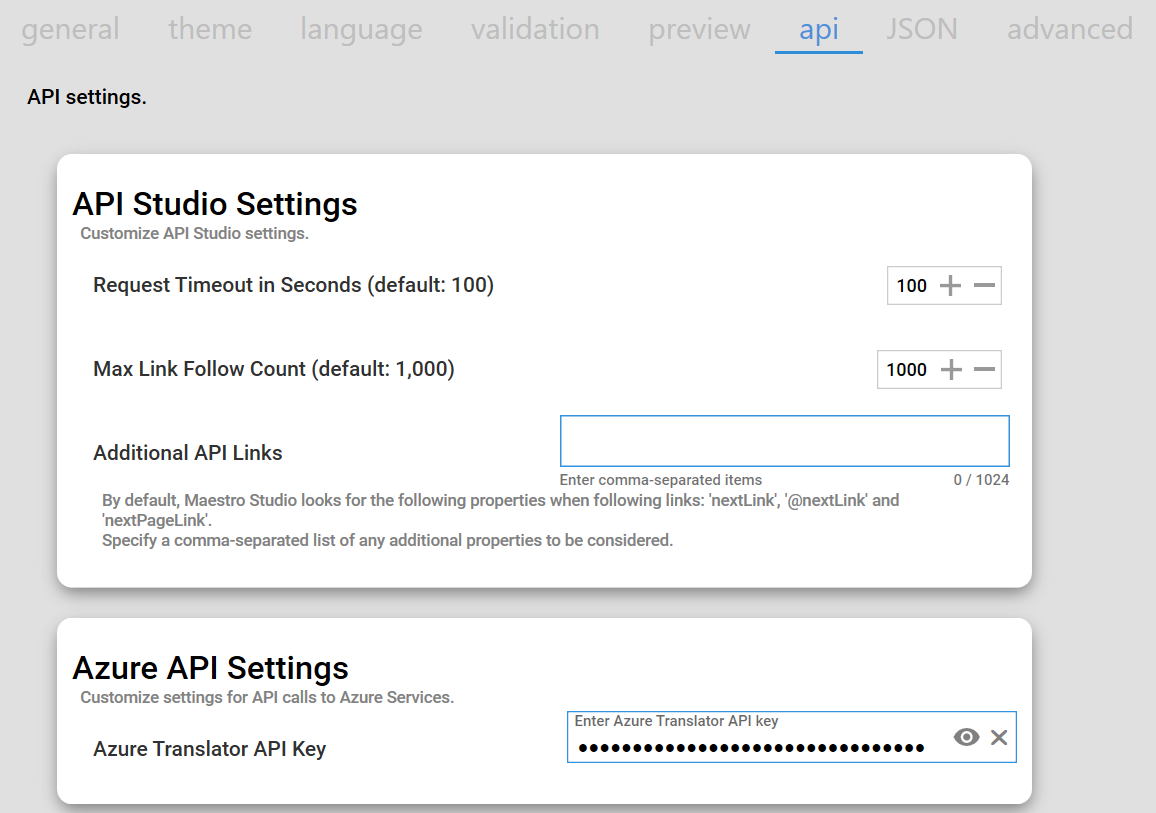 The default set of rules for following paged REST responses can be found under the api tab of Maestro Studio ENSEMBLE (or SOLO), as shown in the screenshot below. Additional patterns can also be specified.