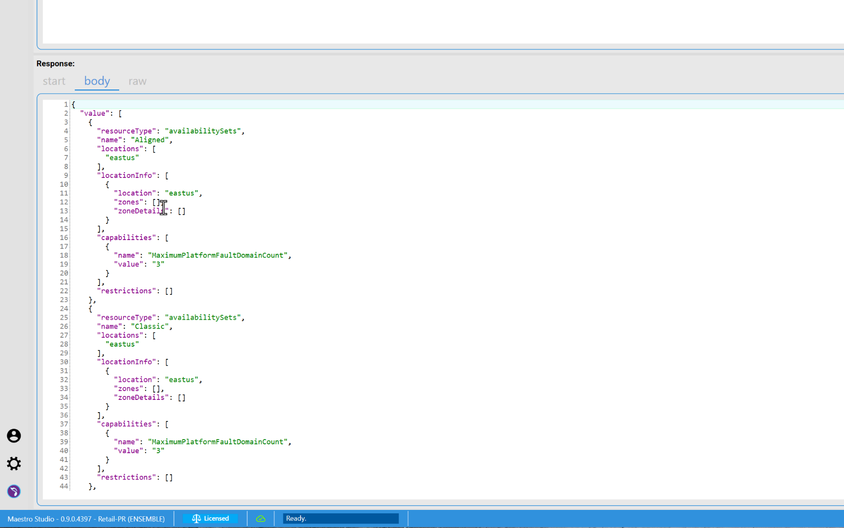 Earlier in this post, we saw the "raw" response payload for a call to the locations ARM API. Here, we take a look at the body of the response, which in this example is a JSON payload listing Azure Computer SKUs available in the region specified in the location parameter.
