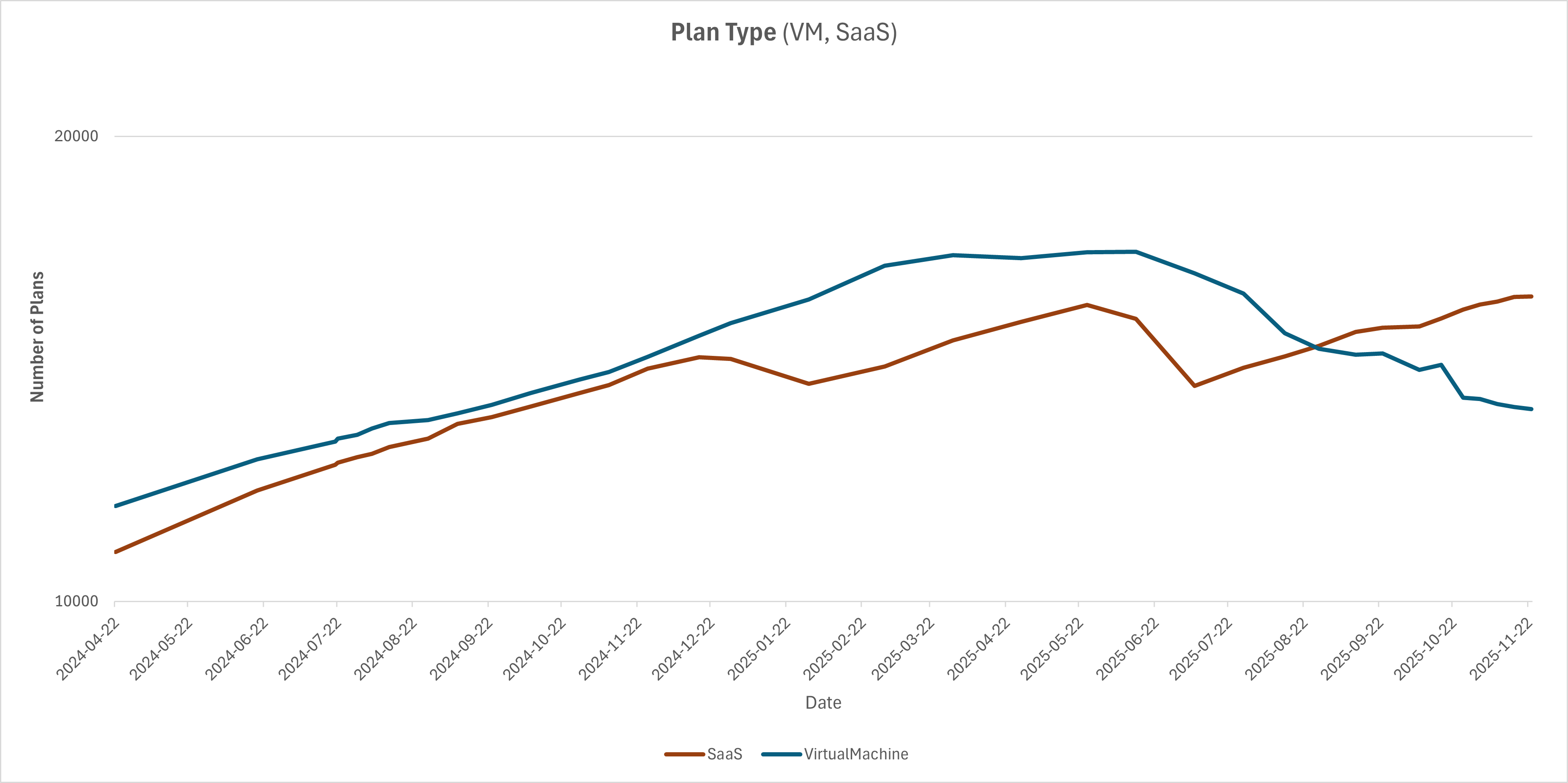 SaaS has the largest number of plans published in the Azure Marketplace, having leapfrogged Virtual Machines to the top spot at the end of August 2025. This is expected due to the significant effort Microsoft is investing in promoting SaaS on Azure.