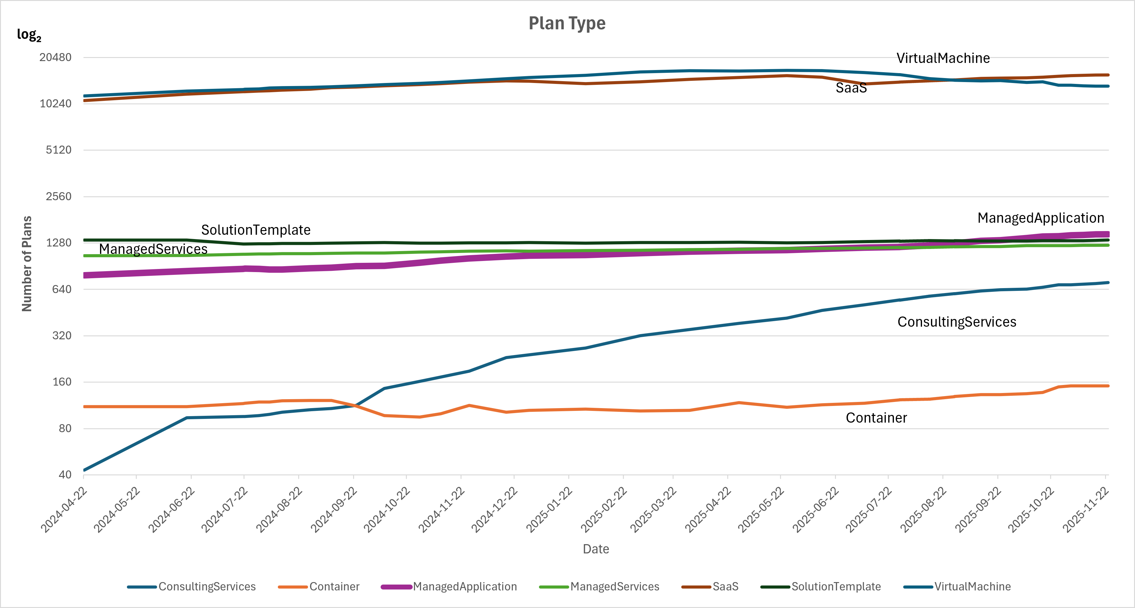 Consulting Services have been steadily increasing over time. While all other offer types have had increases over time, the leader—the Virtual Machine offer type—seems to be losing momentum to SaaS. This will become more apparent as we take a look at growth by plan type since offers can have one or more plans, and some offers—like Azure Applications—have more than one plan type.