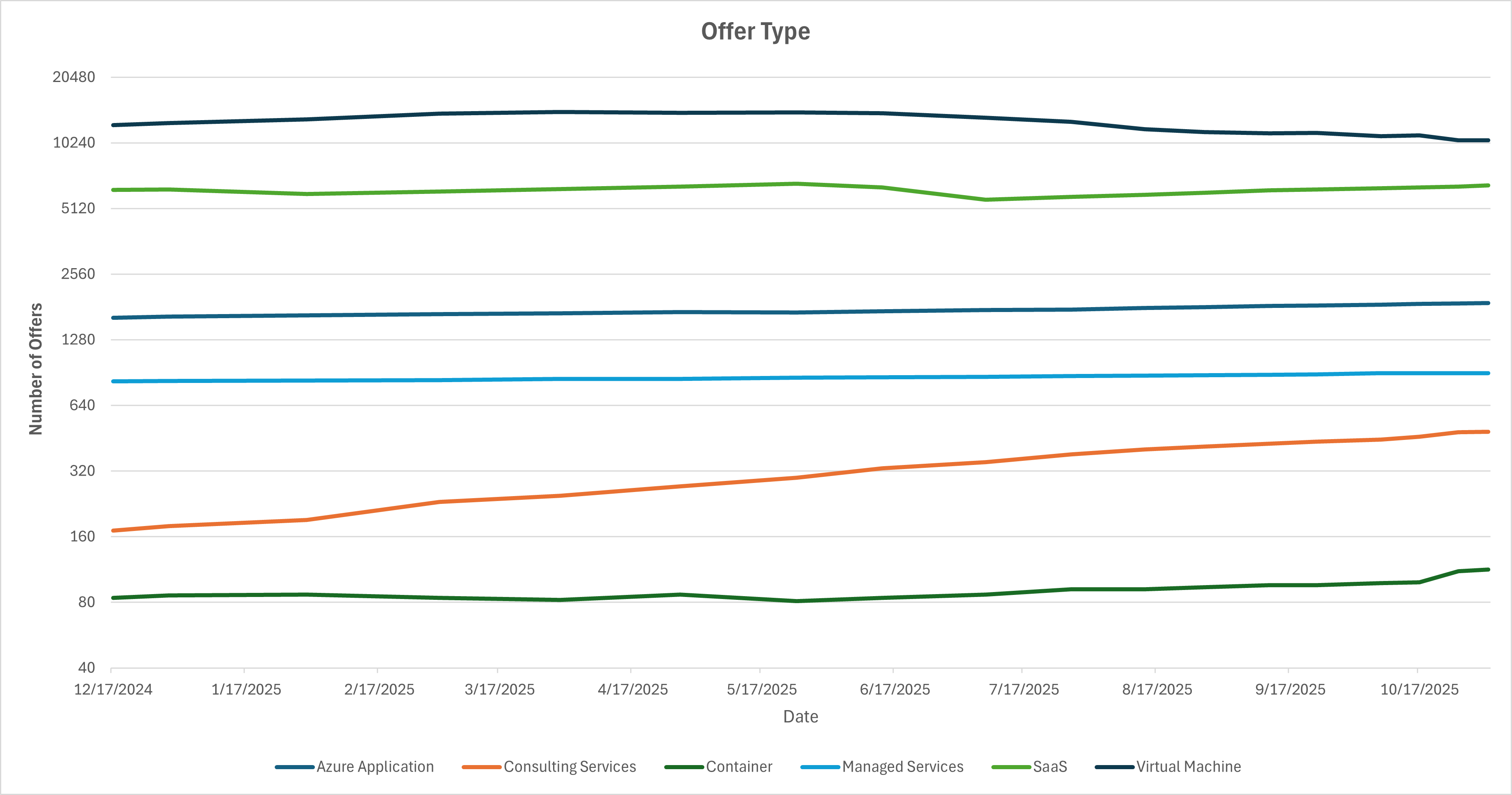 Virtual Machine is the #1 offer type in the Azure Marketplace, followed by SaaS offers. A distant third is Azure Application offers (consisting of Managed Application and Solution Template plan types). Managed Services come next, followed by Consulting Services (Professional Services). Last come Container offers which have not had a growth for years.