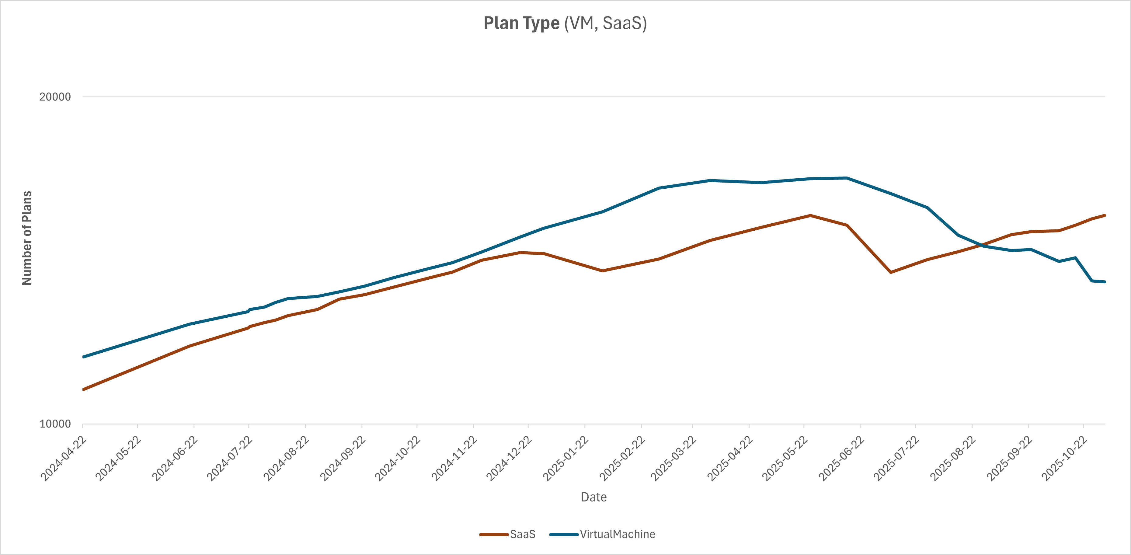 SaaS has the largest number of plans published in the Azure Marketplace, having leapfrogged Virtual Machines to the top spot at the end of August 2025. This is expected due to the significant effort Microsoft is investing in promoting SaaS on Azure.